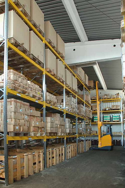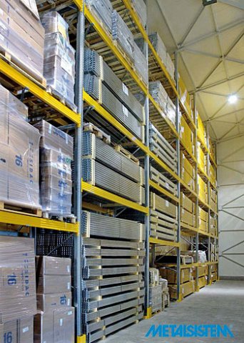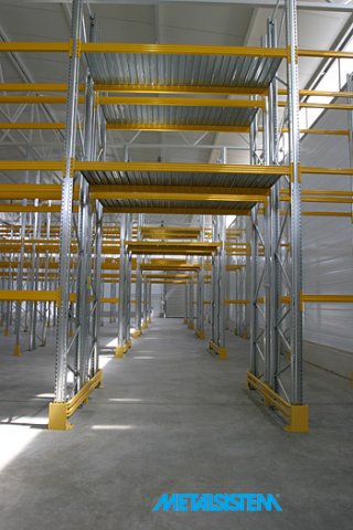 Geometrija vertikalnog stupa je takvog oblika koji predstavlja poboljšanja u odnosu na sve «C» profile koji su prisutni na tržištu metalnih konstrukcija ove vrste. Svi djelovi su od visoko kvalitetnog čelika, površinski zaštićenog cinčanjem metodom Sendzimir, i jamče vrlo veliku i dugotrajnu otpornost na koroziju. Horizontalne komponente su dužinom i nosivosti jako disperzirane i omoguću otimiranje kod projektiranja skladišnih prostora, tj. omogućavaju optimalni izbor verikalnih i horizontalnih djelova konstrukcije da bi se dobila najpovoljnija cijena izvedbe. Grede su izvedene u četiri varijante: 70,105,140 i 172 mm debljine. Nakon cinčanja su bojane u standardnu žutu boju RAL 1004. Prihvat greda na vertikalu se ostvaruje u 5 točaka, preko posebno projektiranih zubiju. Raster stupa je 50mm, što znači da je po visini moguća regulacija svakih 50 mm razmak između paletnih nivoa. |